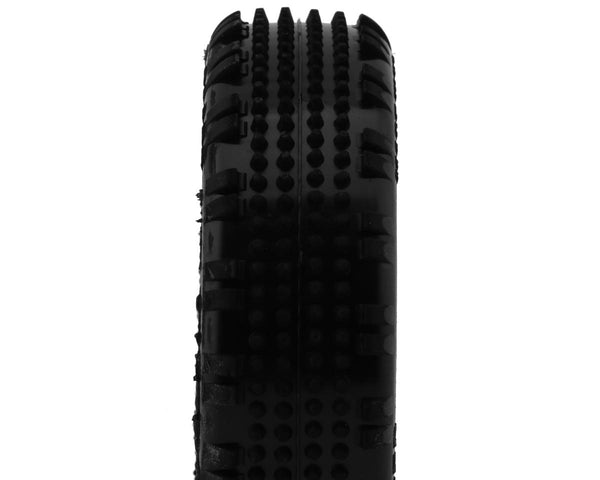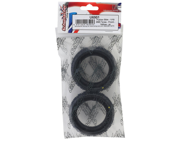 Schumacher Fusion Slim 2WD front tires, a revolutionary addition to the world of RC racing. Meticulously crafted from the popular Low Profile Cut Stagger design, these tires take performance to the next level. What sets them apart is the incorporation of center spikes, elevating steering responsiveness and extending tire life without compromising control. The retention of staggered edges and an undercut sidewall ensures that the added steering capability remains manageable, preventing an overly aggressive response.